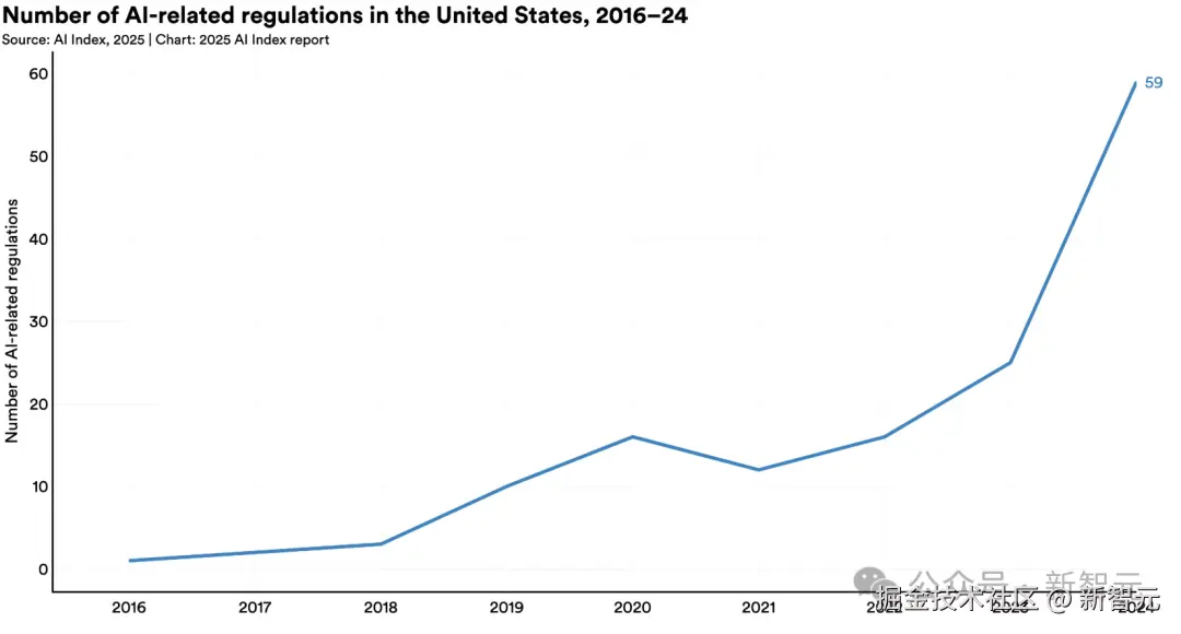 2024 年美国联邦机构颁布 59 项 AI 法规,涉及部门数量翻倍。