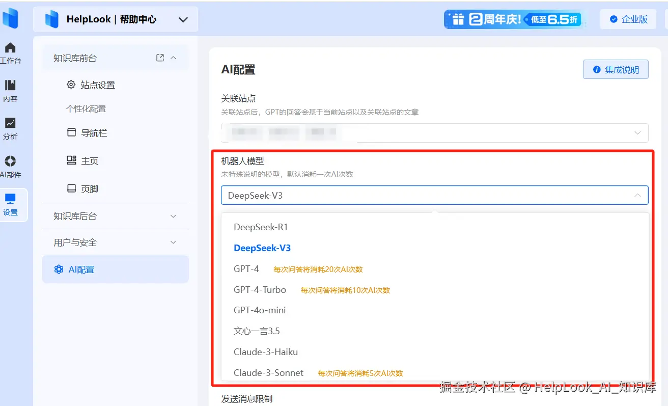 - AI智能搜索:HelpLook集成了DeepSeek/ChatGPT/文心一言/豆包等主流AI模型,可根据需求切换不同算法提升搜索准确率。同时支持用日常语言提问,AI能精准理解意图,让员工“输入一个关键词就能找到答案”。
