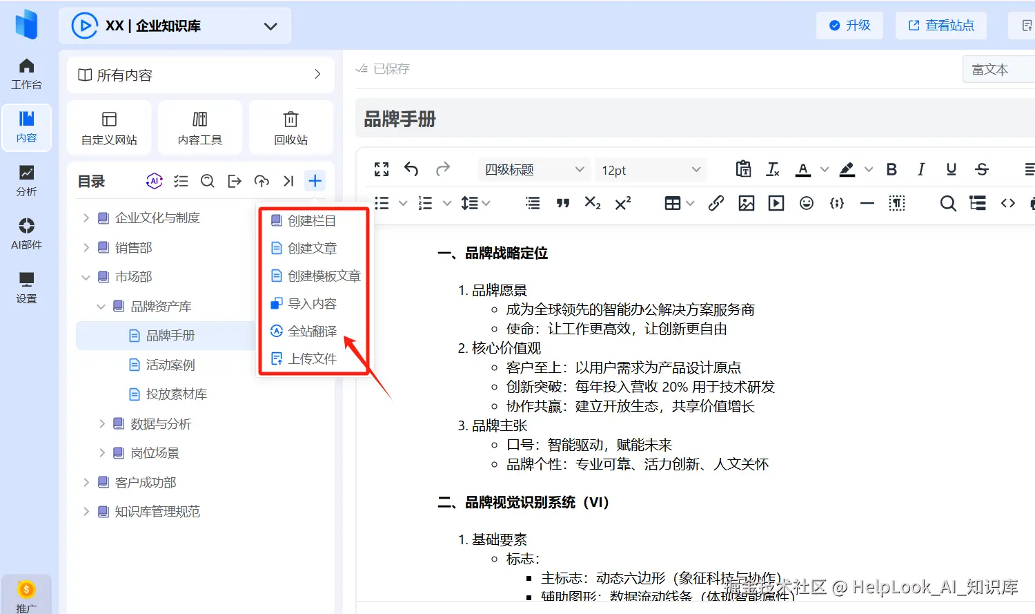 以国内智能知识库平台HelpLook 为例,智能知识库不仅提供基础的内容管理能力,更通过场景化功能设计直击上述痛点。