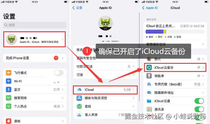 1、查看备份内容:通常可以在iPhone的 【设置】>【你的姓名】>【iCloud】>【iCloud云备份】 中查看。