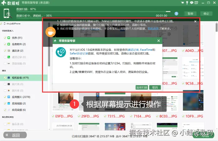 步骤2:扫描过程中,请不要断开设备或者停止扫描,耐心等待软件扫描完成。并根据软件的提示进行正确的扫描操作。