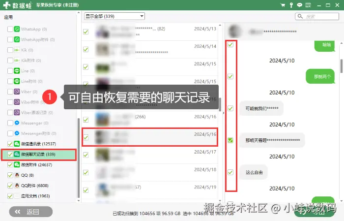 数据蛙苹果恢复专家通过先进的算法和技术,能够恢复更多看似已丢失的数据。且在操作中,软件会严格保护用户隐私,不会泄露任何恢复的数据。那么,如何找回已删除的聊天记录?以下就是简单且高效的恢复步骤: