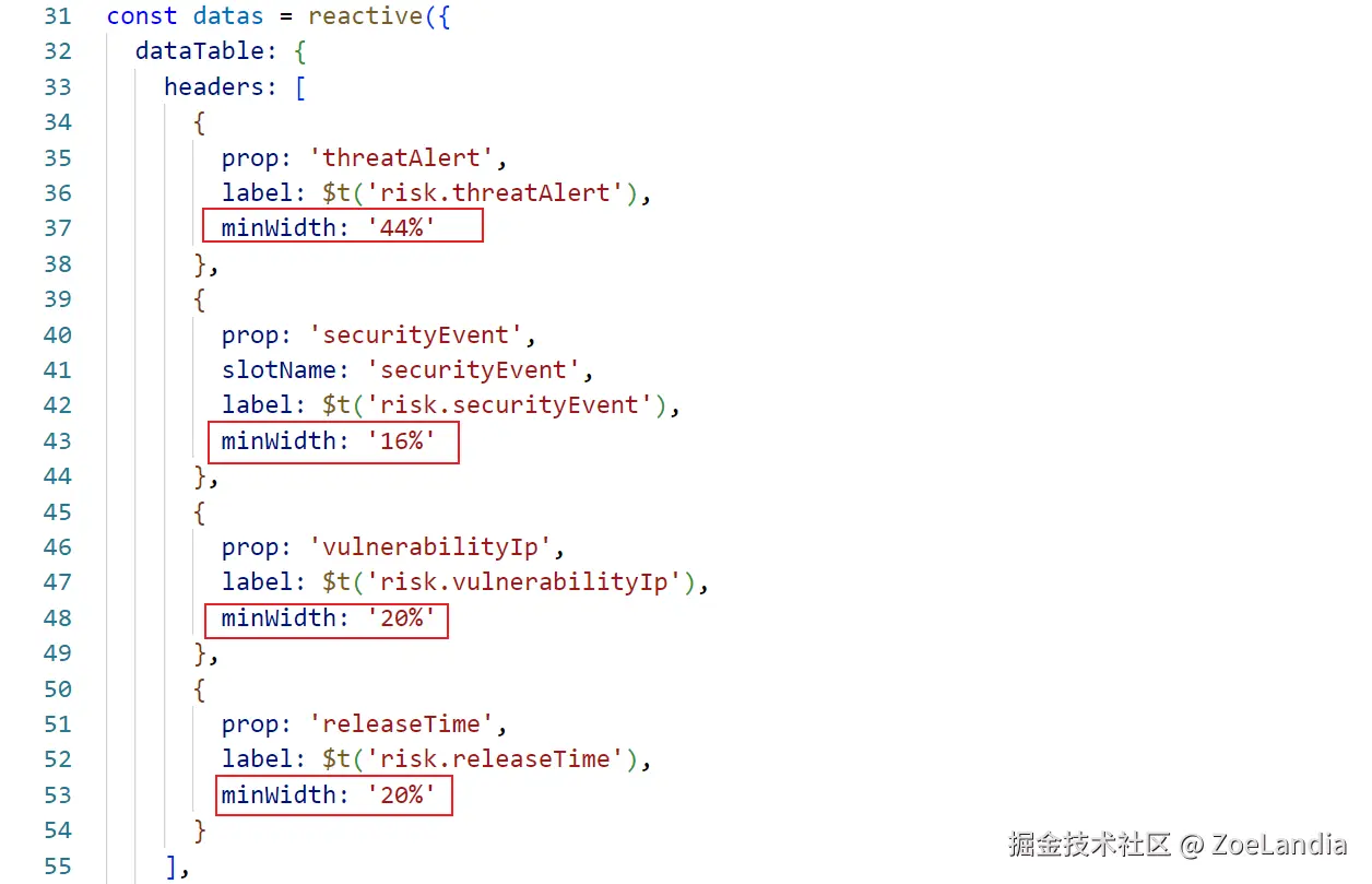 需要注意的是:width,min-width 的原理都是将值百分比去掉变成 px,可是 min-width 会按照比例分配剩余空间,并非直接算的百分比。因此要每一列都设置 min-width 才能实现每一列的百分比配置,设置成 min-width 以后,width 的值就被计算成 (当前值 / 全部列值和)的百分比了