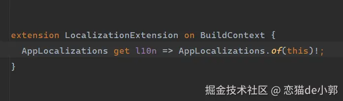 而 context.l10n 这个实现,是通过 Dart 的 extension 拓展 BuildContext 来完成,并且返回时为了方便会通过 ! 来强行忽略空问题: