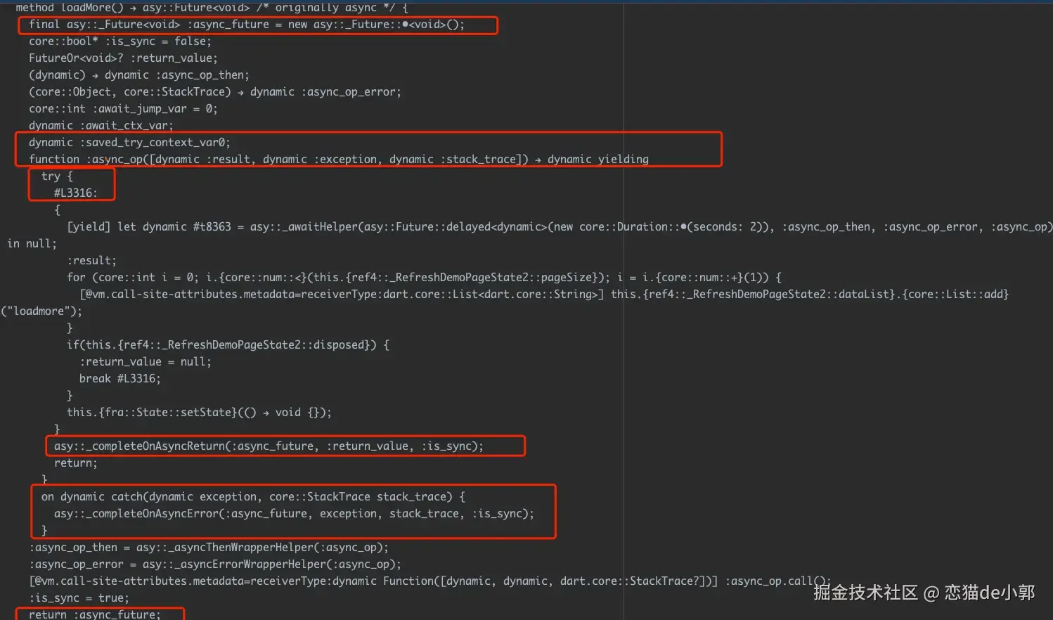 可以看到,此时的 kernel 其实并没有什么编译优化,例如 async 语法糖就没有被展开为状态机,从 dill 代码上看,它基本保留了原始代码的信息,仅仅只是针对添加了一些信息补充,例如: