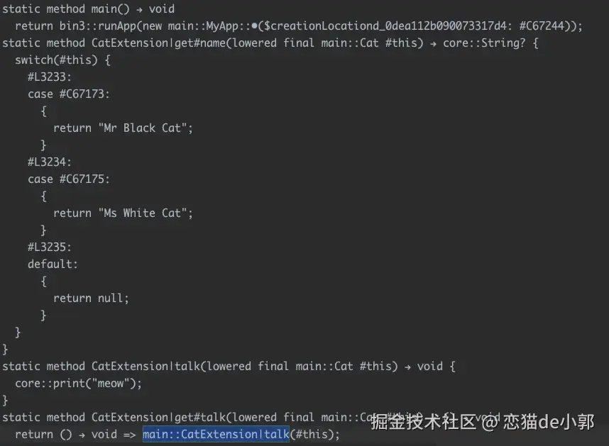 所以看懂 Kernel AST 没什么太大作用,它更多是让你知道更详尽的代码结构而已,不像以前曾经「上古时代」编译后的代码,在 dill 里 late 、 extension 、async 都可以更直观看到它的优化结构: