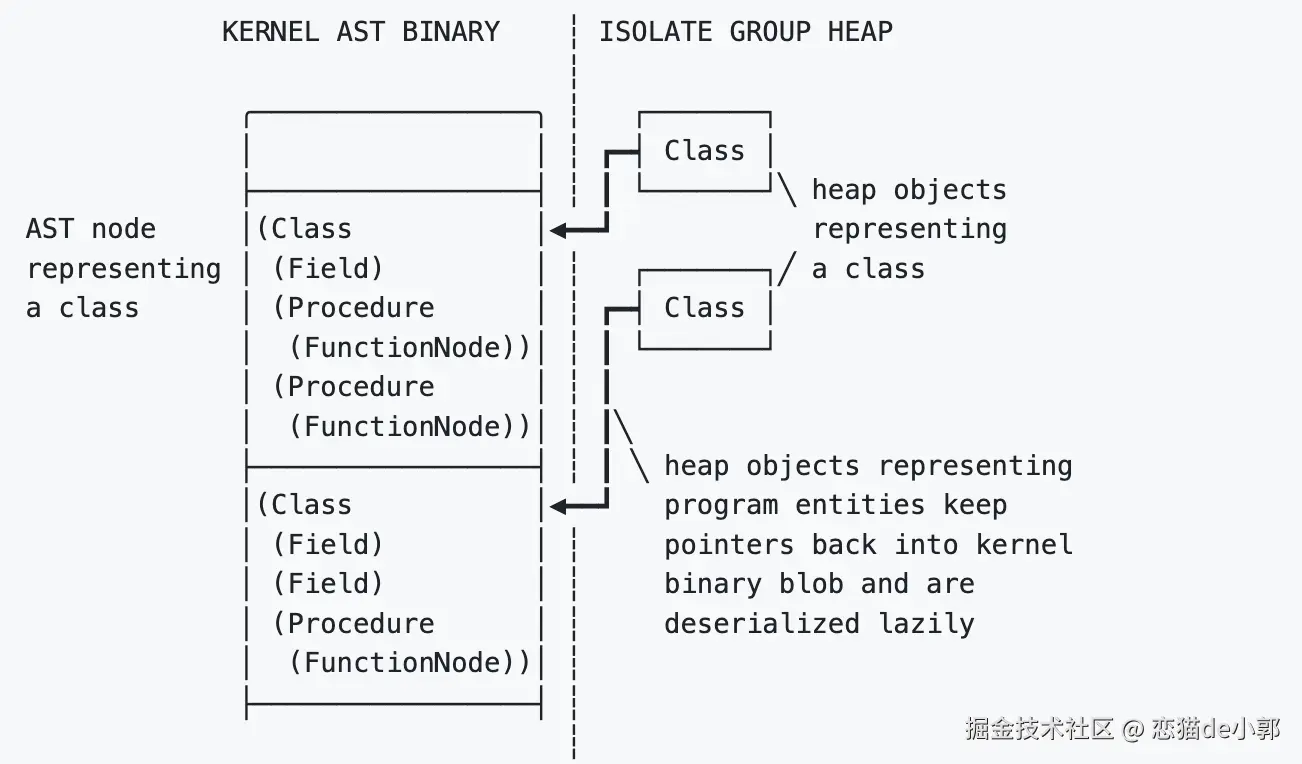 所以可以看出来,AST 一般是源代码的抽象语法结构的树状表现形,而转化为 AST 是为了更适合程序分析,在 Dart 里,Kernel AST 因为不包含解析后的各种类和函数,所以它虽然是二进制,但是包含详细信息,从而可以在不同平台之间移植。