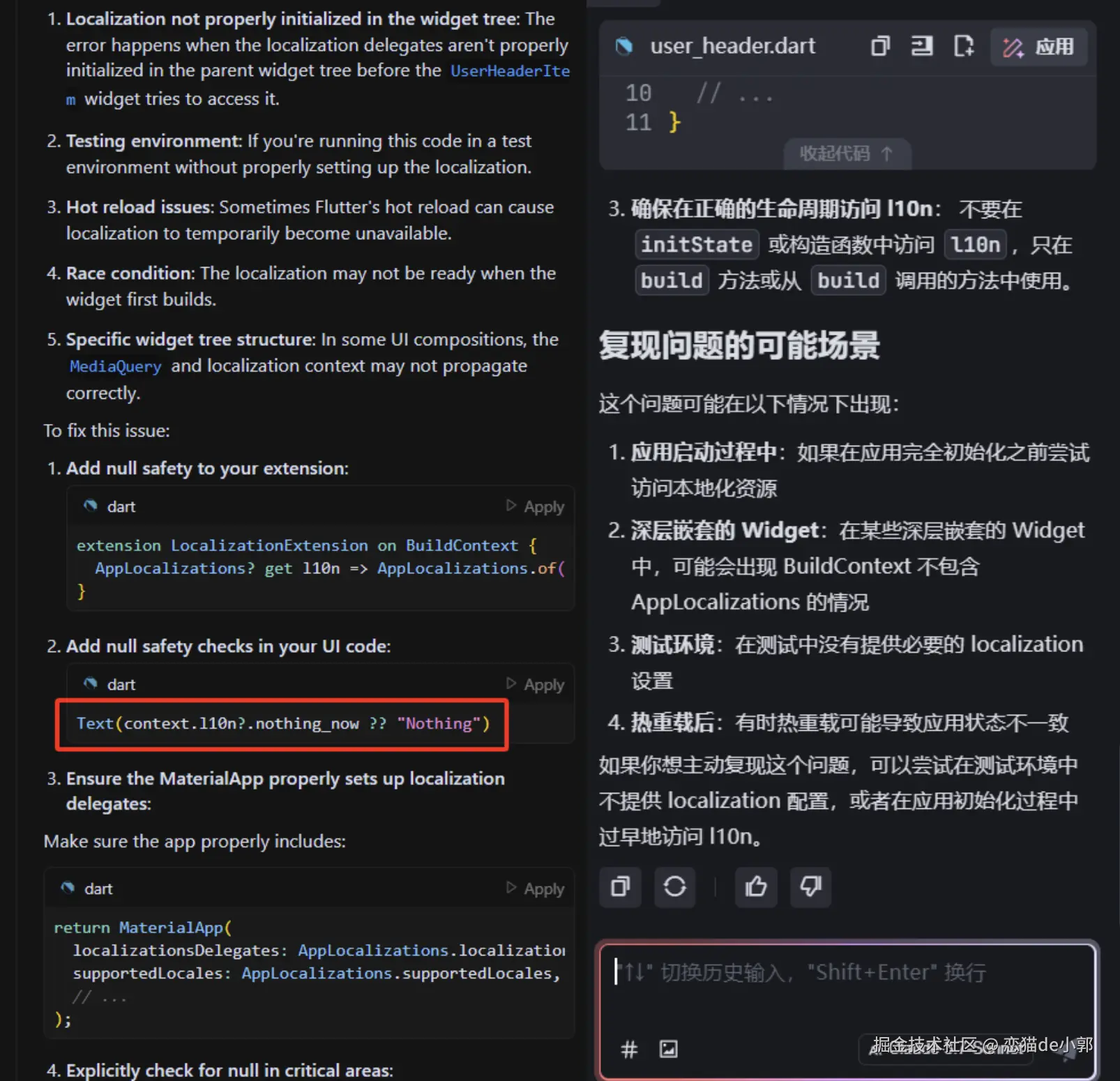 但是虽然知道了问题的点在于 context 获取不到 l10n,但是一时半会也没看出来代码哪里有问题,因为这是一个正常的 context ,使用的位置也正常,通过这个 context 没理由获取不到 AppLocalizations 多语言对象,并且 l10n 在同个文件其他地方都是正常,甚至 debug 时通过这个 context 执行 AppLocalizations.of(context) 是可以正常获取 ,那为什么在这里就不行?
