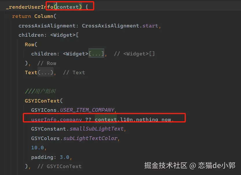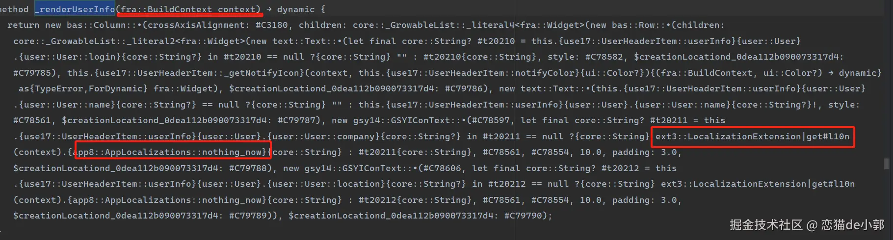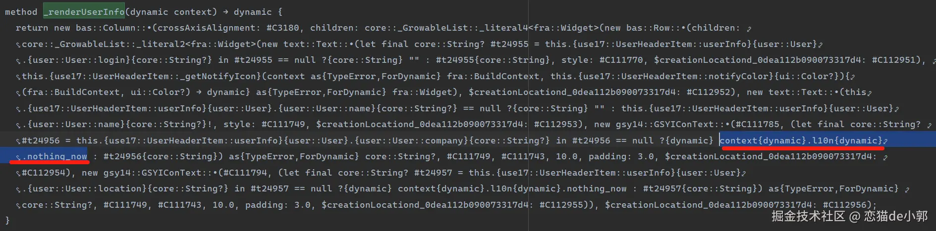 可以看到,因为 _renderUserInfo 函数在声明时没有给 context 指定 BuildContext ,所以编译后它是一个 dynamic 类型,从而导致后续 context.l10n 也出现类型不对,无法正确被编译为 AppLocalizations 导致的一系列问题: