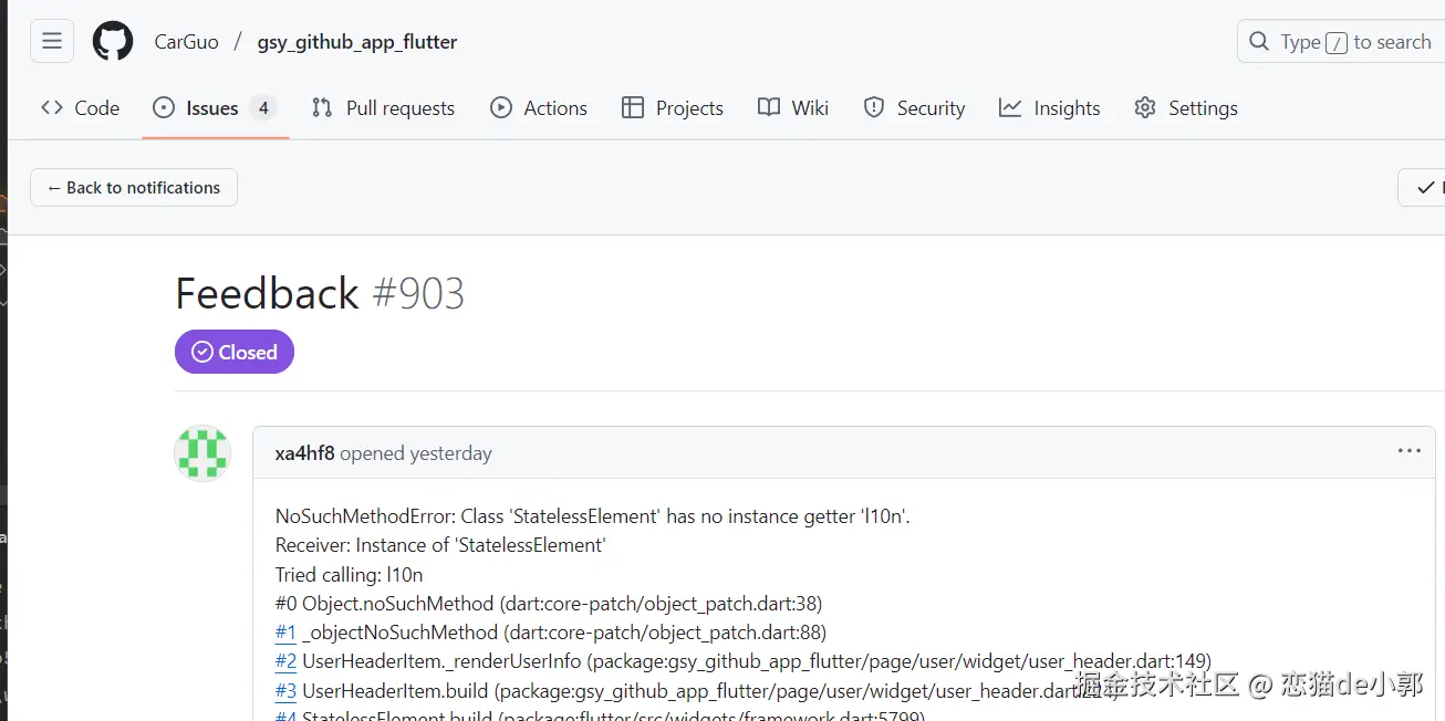 事情的起因是最近在 Github 收到了一个 issue ,内容是在获取 l10n 多语言相关实现时找不到该方法,从而导致 NoSuchMethodError 的问题: