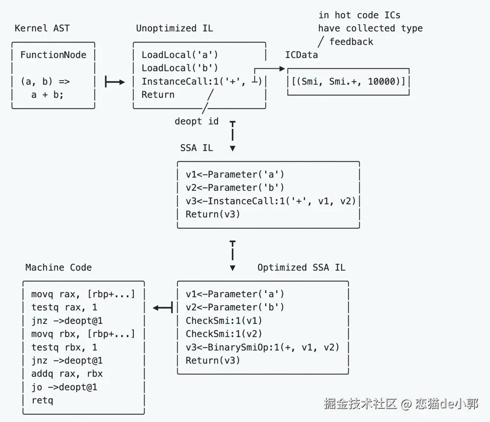 另外, Kernel AST 在这里属于 IR 的存在,在后续还有 IL 和 Optimized SSA IL 等处理才会变成 Machine Code ,例如上面的 a+b ,在 Optimized SSA IL 阶段理论上会处理为 smi (small integers) :