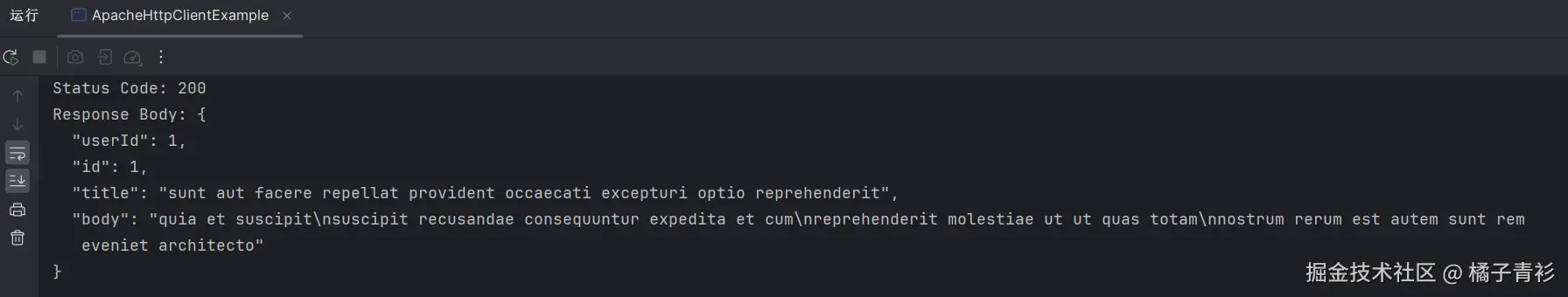 该案例在main方法中,使用try-with-resources语句创建了CloseableHttpClient实例,该实例负责发送HTTP请求,并创建了一个HttpGet请求对象,目标URL指向jsonplaceholder.typicode.com/posts/1 (提供假数据的API)。然后再次使用try-with-resources语句执行该请求并获取CloseableHttpResponse响应对象。在响应对象的作用域内,程序打印了HTTP响应的状态码,并使用EntityUtils.toString方法将响应实体转换为字符串,最后打印出响应体的内容。如果在执行请求或处理响应时发生任何异常,这些异常将被捕获并打印到标准错误输出。