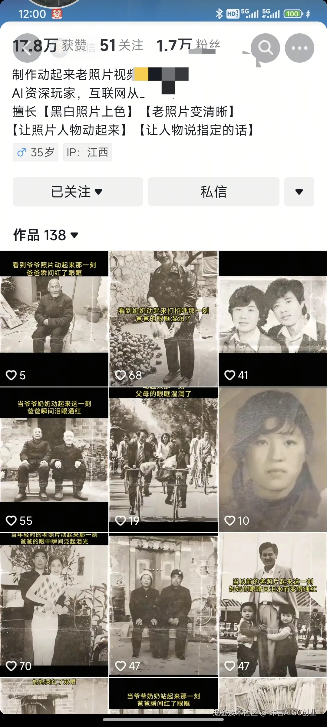 下面是我在抖音上找的一个账号,就是通过每天发短视频引流客户到微信进行成交,我私下加了作者,了解到照片修复、上色、复活单价大概是 20-70(不得不说还是私域香)。