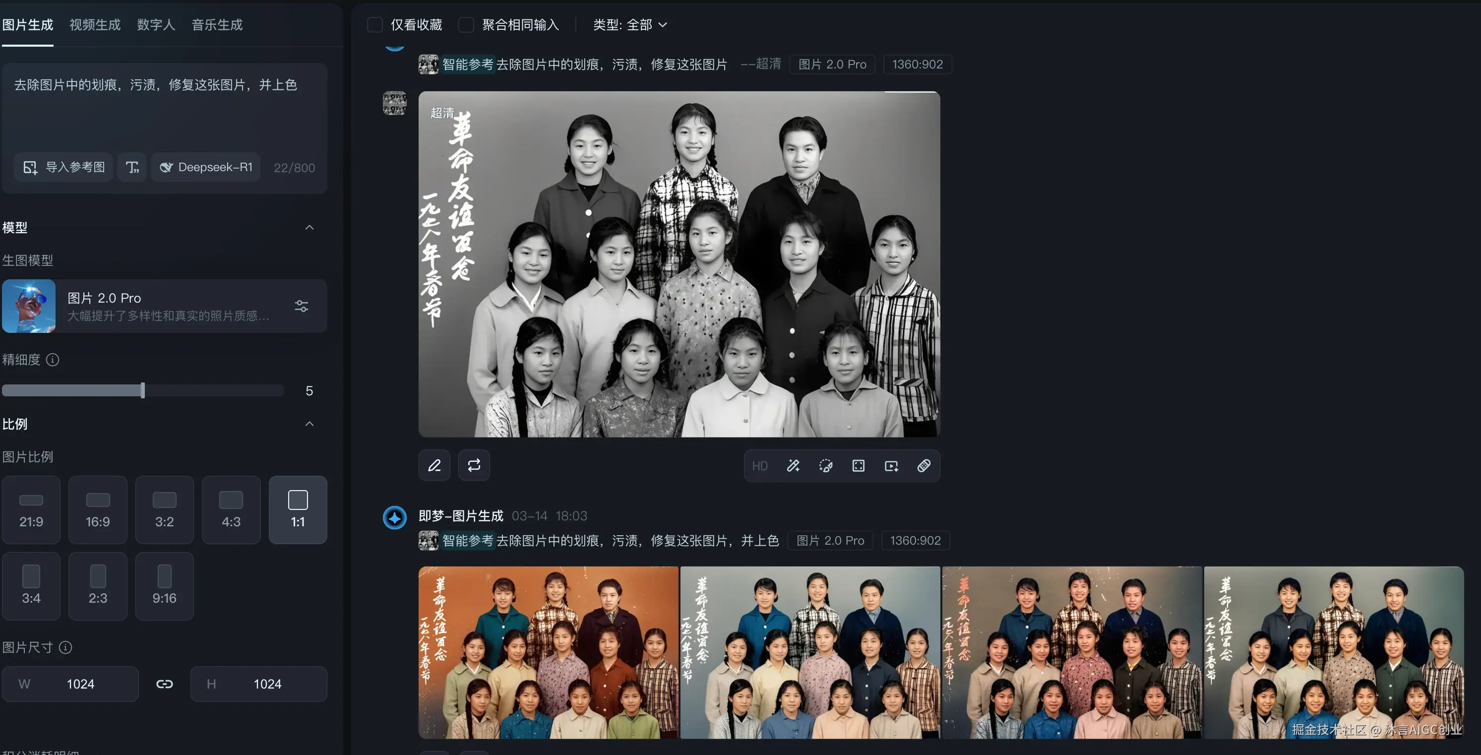 另外使用即梦的图片生成(现在有免费积分可以使用)功能效果也非常好,提示词:去除图片中的划痕,污渍,修复这张图片,并上色