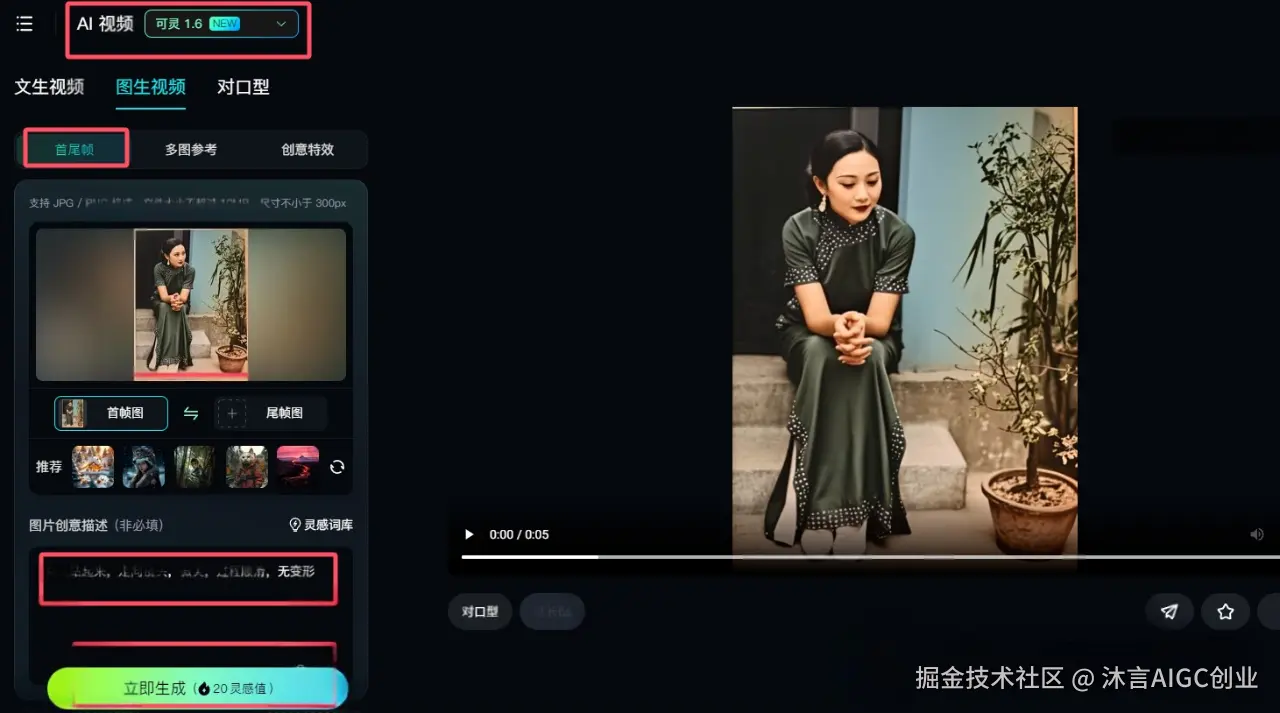 这里推荐使用可灵,大多数场景下可灵的效果还是最好的,按照如下配置: