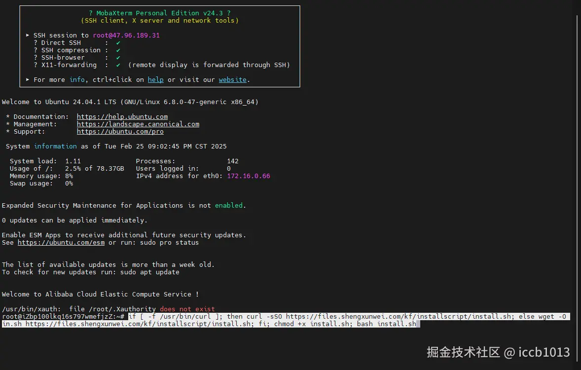 连接服务器终端之后,粘贴以上命令并执行: