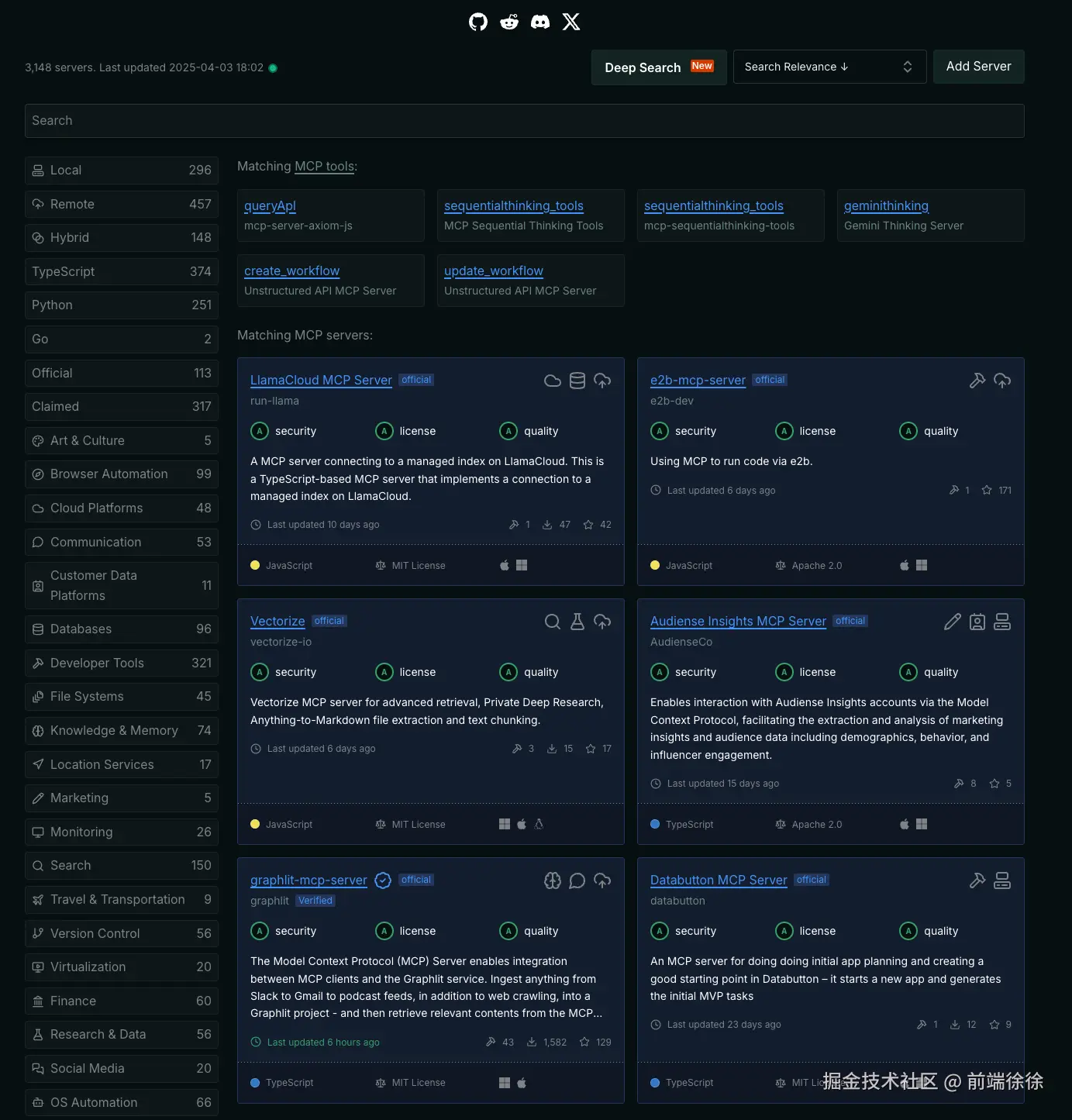 非常有意思的是这些服务和工具基本都是用 Typescript / Javascript 或者 Python 开发的,MCP 的 SDK 其实还有Java、Kotlin、C# 版本的,但是绝大部分都是 Typescript / Javascript,对前端开发者非常友好,另外就是 Typescript / Javascript 有天然的优势,简单容易上手,跨端运行,环境适配丰富,App、 桌面端、 服务端、网页、 插件等等。但是从另外一个角度看,前端为啥都跑去做 AI 了呢,值得思考,或许前端的需求量真的在减少了,前端工程师们都在做逐步的转型(胡乱猜测)。