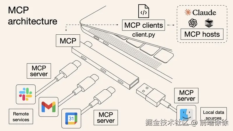 MCP 就像 USB-C 一样,可以让不同设备能够通过相同的接口连接在一起,可以理解为通用协议层,你要接入我的主机,你就按我的协议来就可以了。