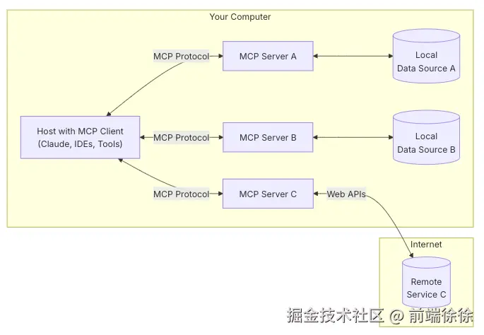 MCP 遵循客户端-服务器架构,其中: