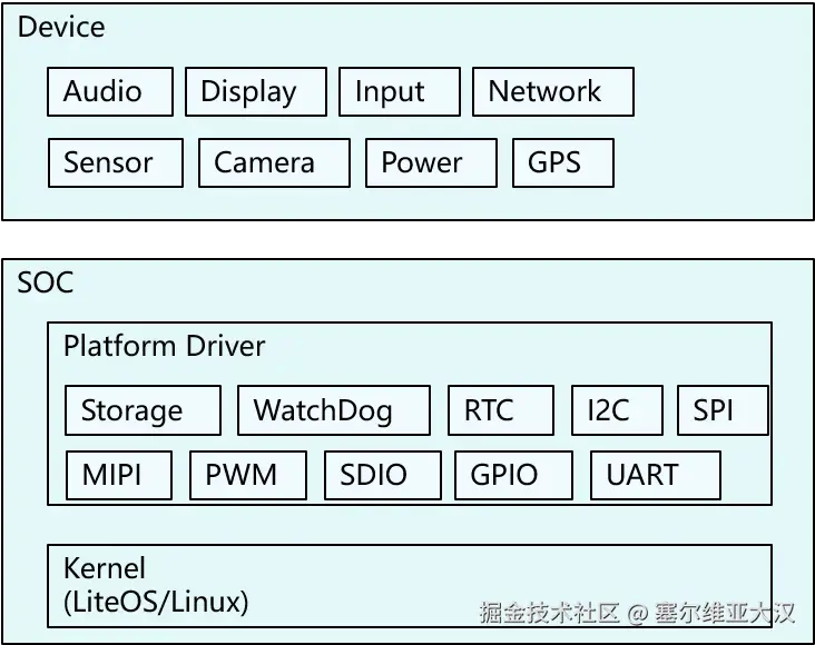 驱动主要包含两部分,平台驱动和器件驱动。平台驱动主要包括通常在SOC内的GPIO、I2C、SPI等;器件驱动则主要包含通常在SOC外的器件,如 LCD、TP、WLAN等