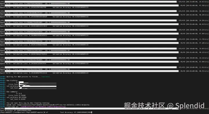 在nf数据集上面精度为87.260% ,训练时间为26.67分钟。这一精度表明该模型能可靠的识别出有抗非特异性吸附性潜力的肽,有助于在肽的设计和应用中做出更好的决策。论文中的测试精度为88.365%,训练时间为58.28分钟,在昇腾平台上面以不到一半的训练时间可以达到论文99%的效果。该模型可以在昇腾上进行训练和推理,且性能极强。