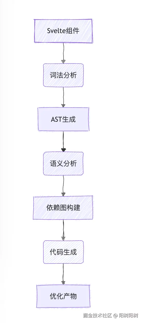 .svelte)解析为抽象语法树(AST)。 - 过程:编译器读取组件的 HTML、CSS 和 JavaScript 代码,识别出模板、样式和脚本部分,生成对应的 AST 结构。