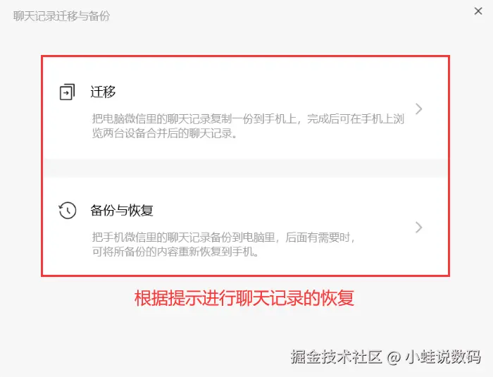 步骤2:打开微信后,在设置中找到 【聊天记录迁移与备份】 选项,根据提示选择备份文件进行恢复。