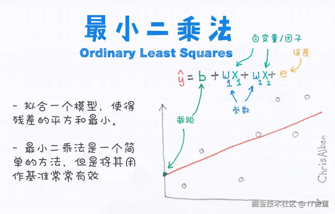 最小二乘法(Ordinary Least Squares, 简称 OLS)是统计学和机器学习中最常见的线性回归方法之一。