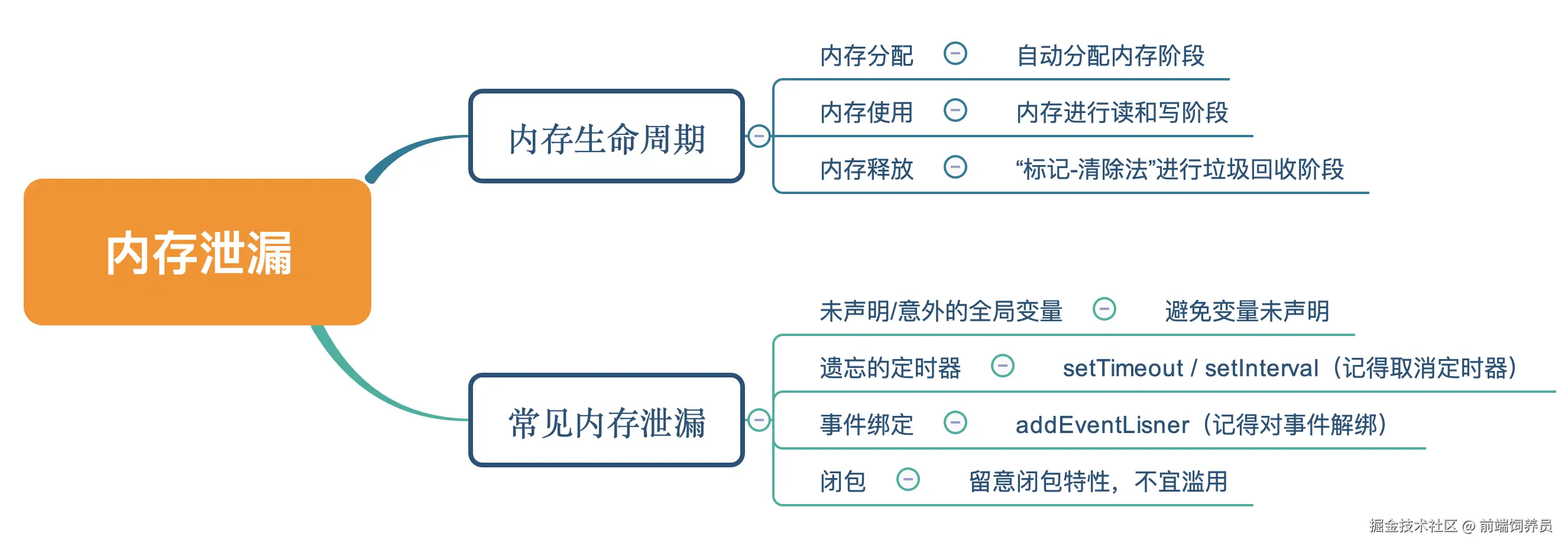 今天的分享到这里就结束了,最后我们来回顾一下今天讲的内容。内存泄漏发生在 JavaScript 内存自动回收阶段,浏览器引擎在“自动”回收阶段使用的是标记清除算法,可以将“不可获得”的对象进行回收,如果我们编写代码的时候对一些全局变量处理不当,定时器和事件绑定没有及时清除,或者闭包使用不当,就会引起内存泄漏问题。所以为了避免内存泄漏,最重要对一点就是养成良好对编程习惯,比如内存分配后,一定要注意写好内存释放的代码,有借有还,才能高效运转,再借不难。