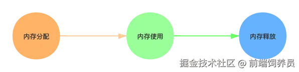 我们先来简单了解下这三个部分都做了什么事情:第一部分是内存分配,当我们创建一个函数或者变量时,必须为它分配一定数量的内存;第二部分是内存的使用,对分配的内存进行读和写操作;第三部分是内存释放阶段,将不需要的内存进行释放。