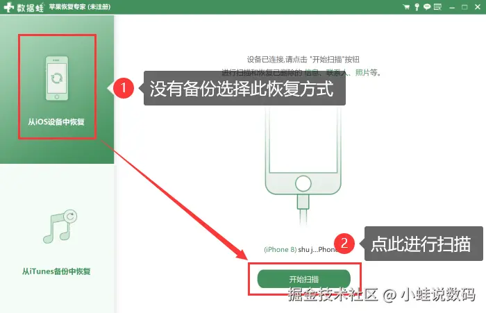 第一步:打开苹果恢复专家,根据实际情况选择合适的扫描方式,并点击 【开始扫描】 进行操作。
