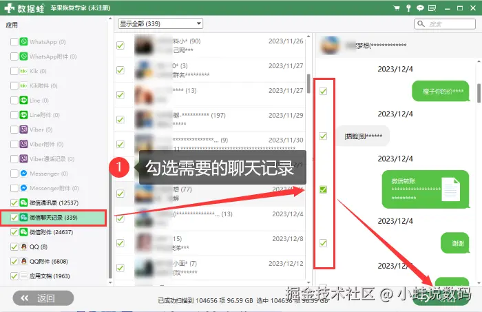 第二步:扫描完成后,选择 【微信聊天记录】 ,并勾选您需要的聊天记录进行恢复并导出至指定位置进行安全保存即可。