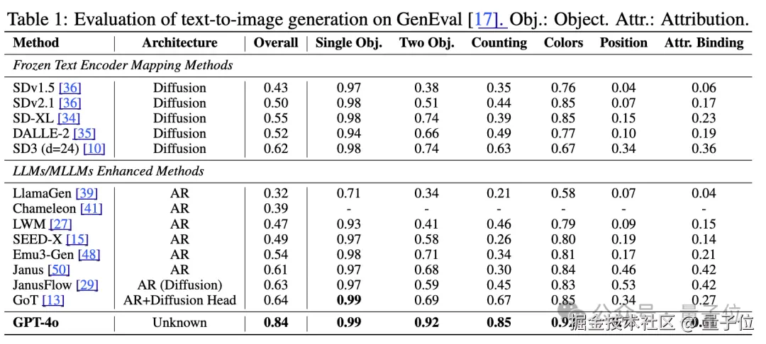 在文本生成图像(GenEval)任务中,GPT-4o 取得了 0.84 的总得分,超越目前所有扩散类与自回归类图像生成模型。