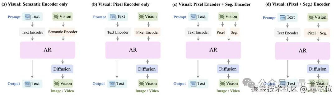 因此,作者认为如果采用了 pixel encoder,其大概率是连续(非 VQ)的而不是离散(VQ)的,并基于此提出了四种可能的完整架构示意图。