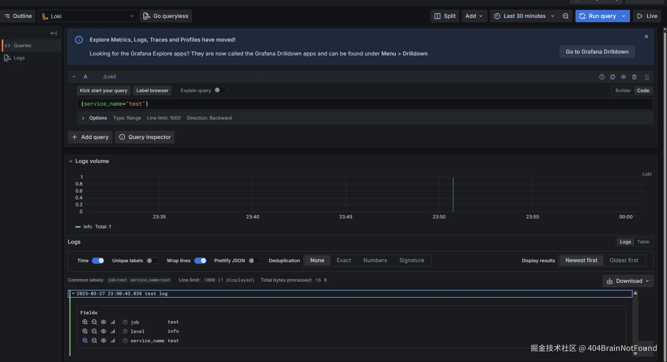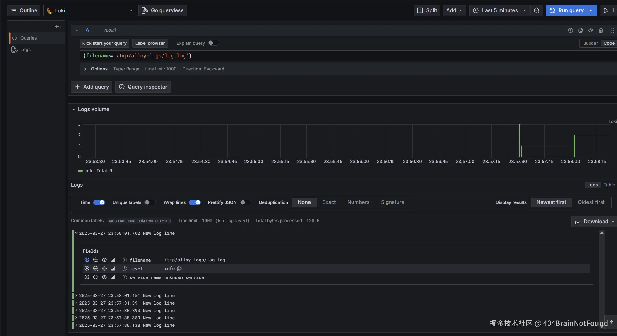 向本地文件写入log日志echo "New log line" >> /tmp/alloy-logs/log.log