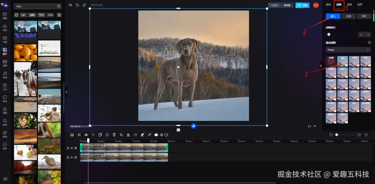 选中图片或其他素材,点击“动画”,选择渐显或是其他动画效果,也可设置动画时长。这种方法可以调整动画时长,且在过程或离开时也可以添加动画效果。一键添加即可。