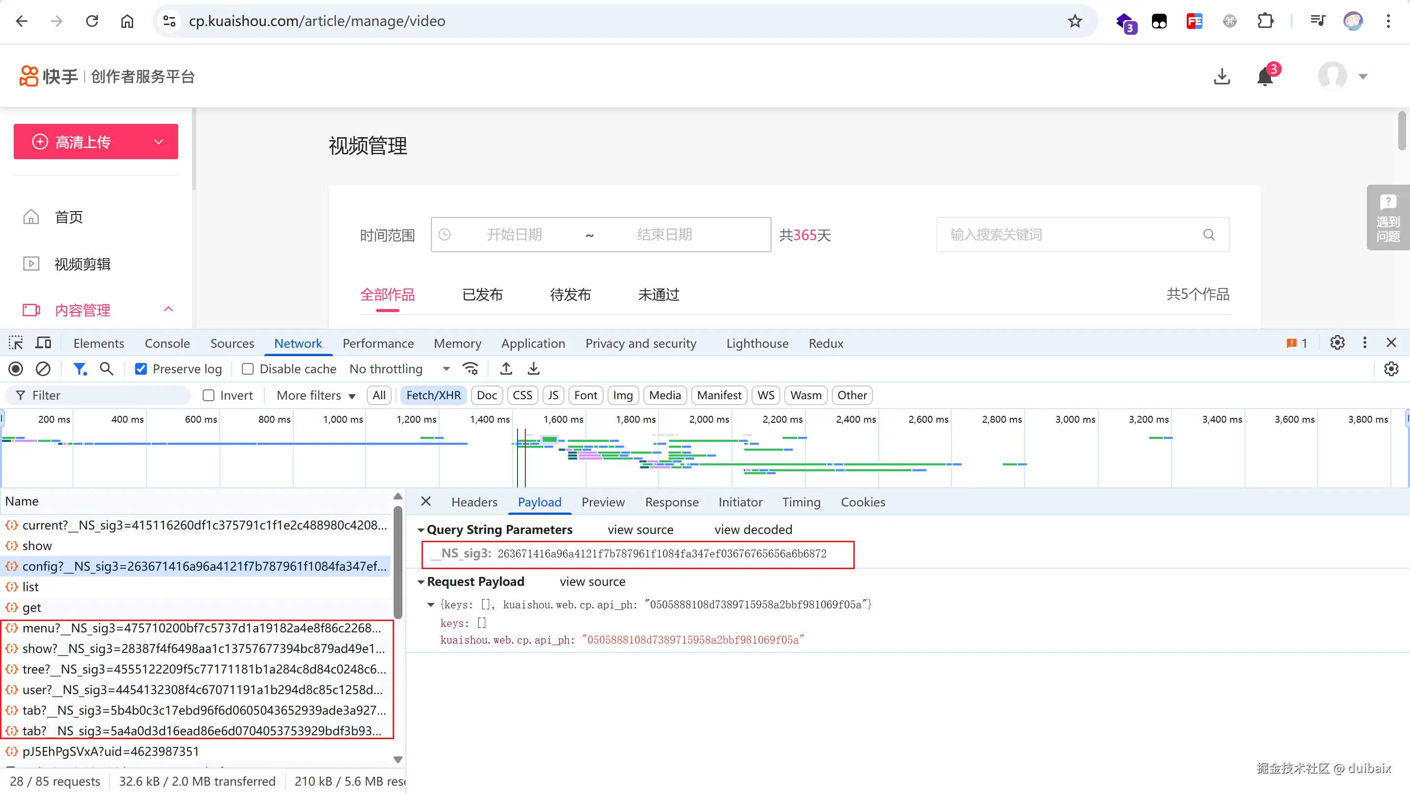 快手获取数据的接口基本上都带有 **__NS__sig3**这个加密参数, 而且每一次请求所携带的值不同