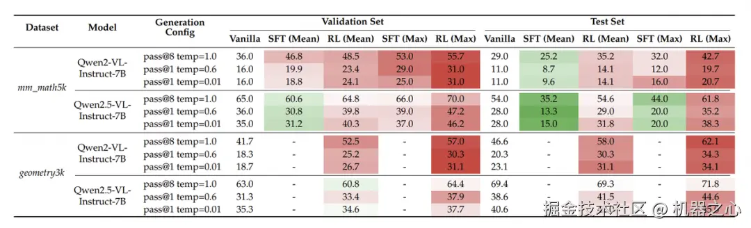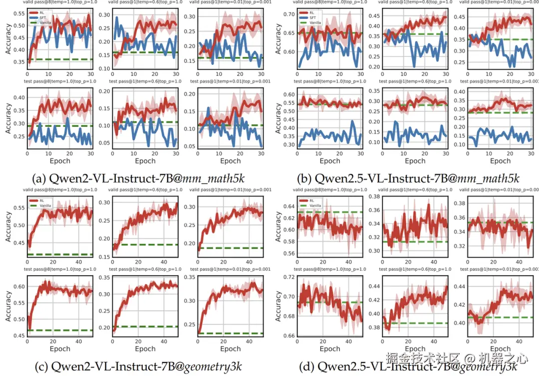 在相同高质量监督数据(来自 textbook-style CoT)下,RL 在验证集和测试集上均显著优于 SFT,且具有更强的 OOD 泛化能力。即便是 Qwen2.5-VL 这类强基座模型,也能从 RL 中获得额外提升。