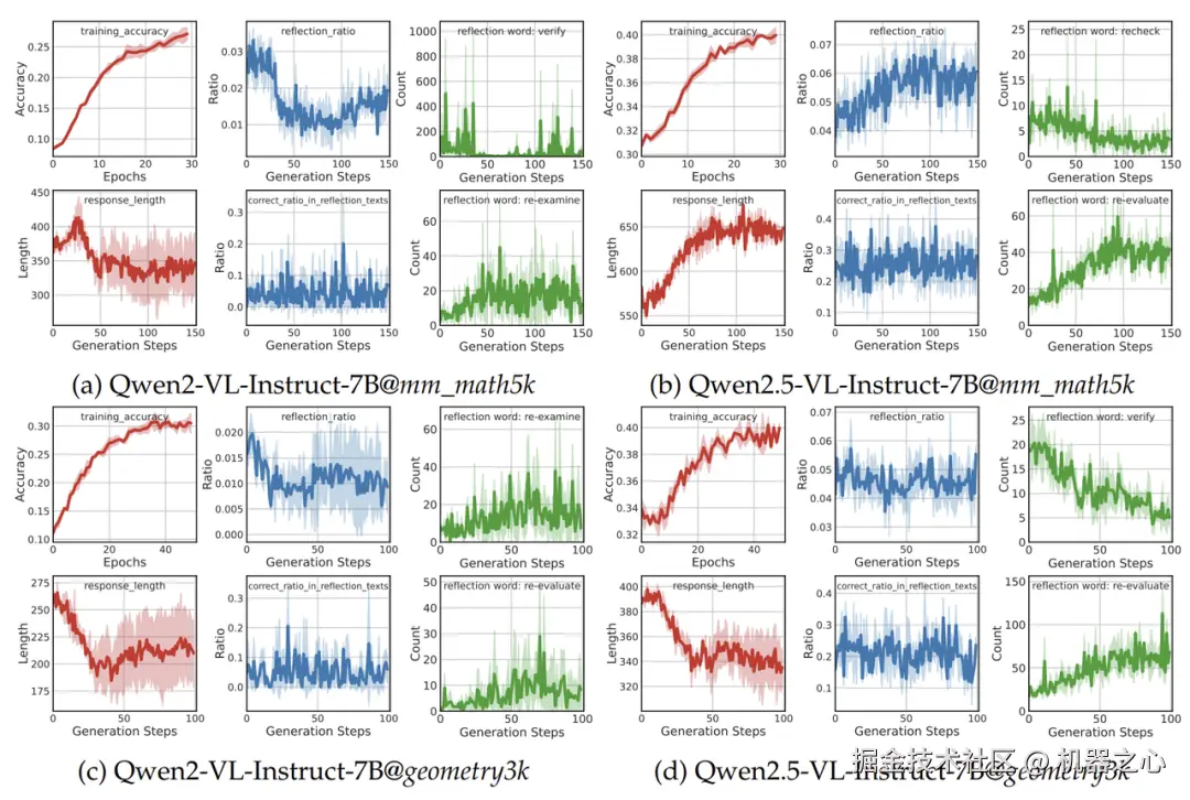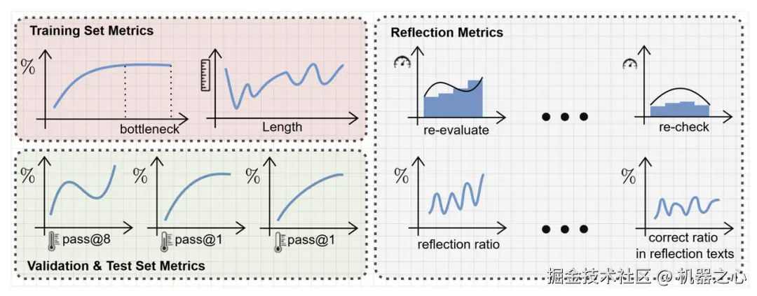 在多个模型和数据集上,系统追踪了训练动态与反思行为