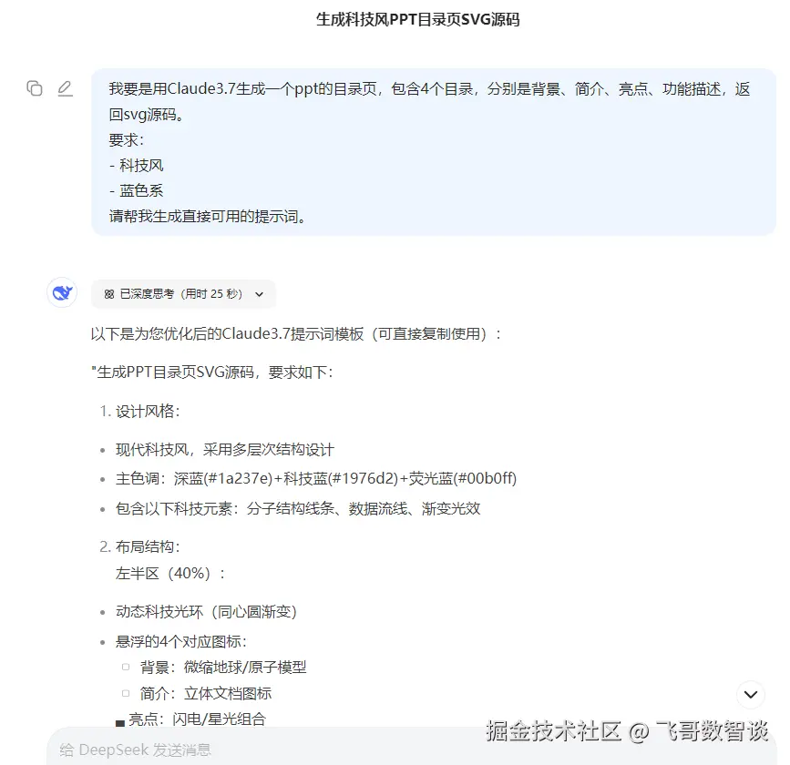 和之前最大的不同就是在直接生成 SVG 前,通过 DeepSeek 将简单的需求转换为规范的提示词,减少大家实践难度。