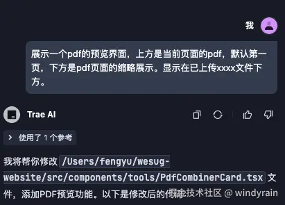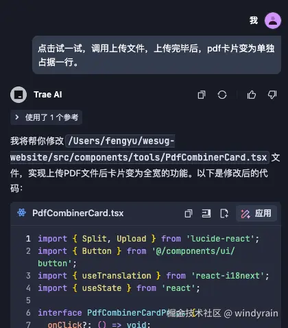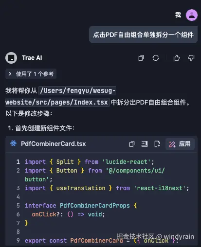 所以第一步,我们需要指挥 Trae 把这个组件拆出去。如下图所示,Trae 会在合适的文件目录里新建一个 PdfCombinerCard.tsx