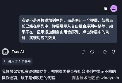 如上图,左侧第一次描述后,AI 忽略了交互性,直接使用右键,第一次点是选中,再点是取消,这个不太符合人的习惯,所以再强调下,就可以完成这个功能啦。