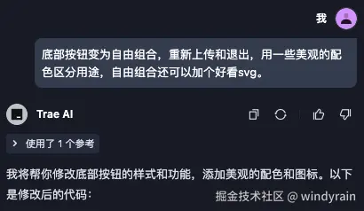第二步,我们需要点击按钮后能上传文件,并有一定的交互感。给 Trae 提供如上图指令后,他就可以轻松的实现该效果。