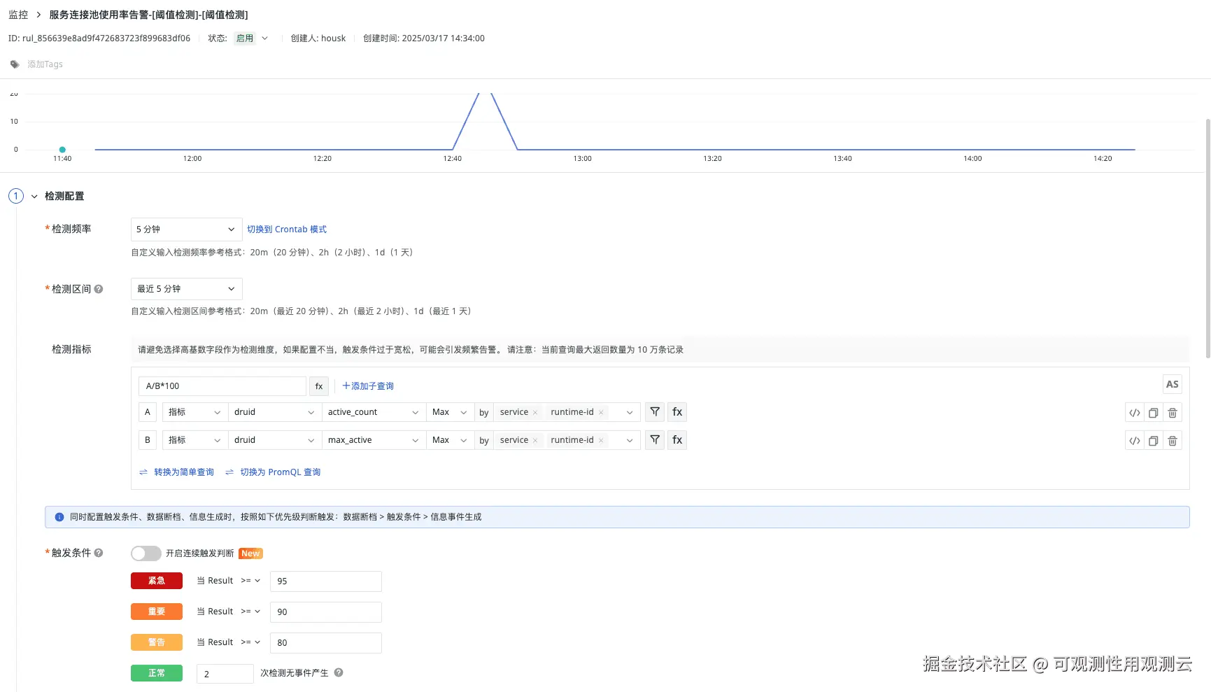 简要描述:检测指标 active_count/max_active ,当使用率超过80%,触发告警,如下图: