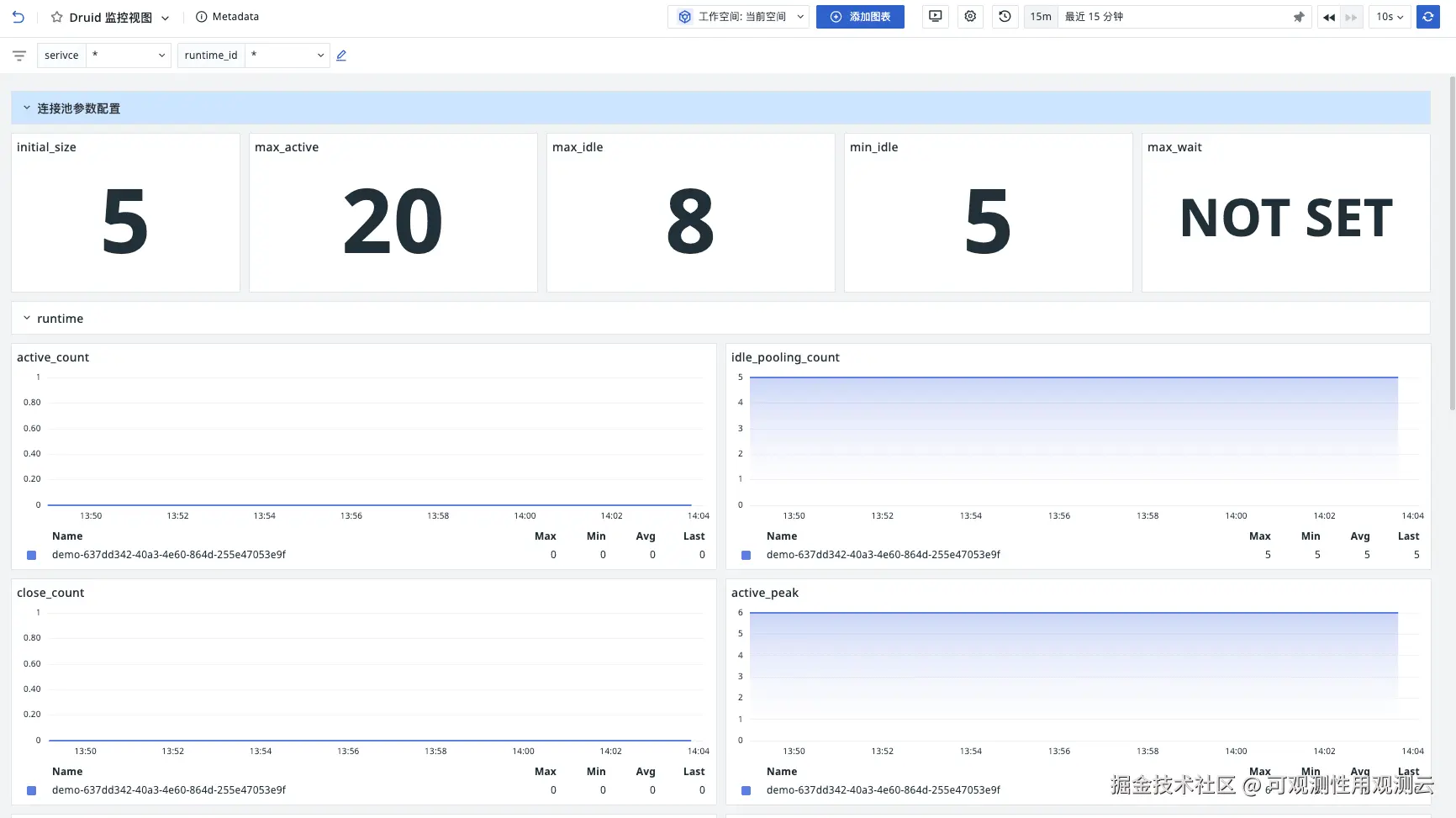 以 Java Demo 应用为例,采集调用链路和 Druid 连接池指标。Demo 项目中连接池配置如下: