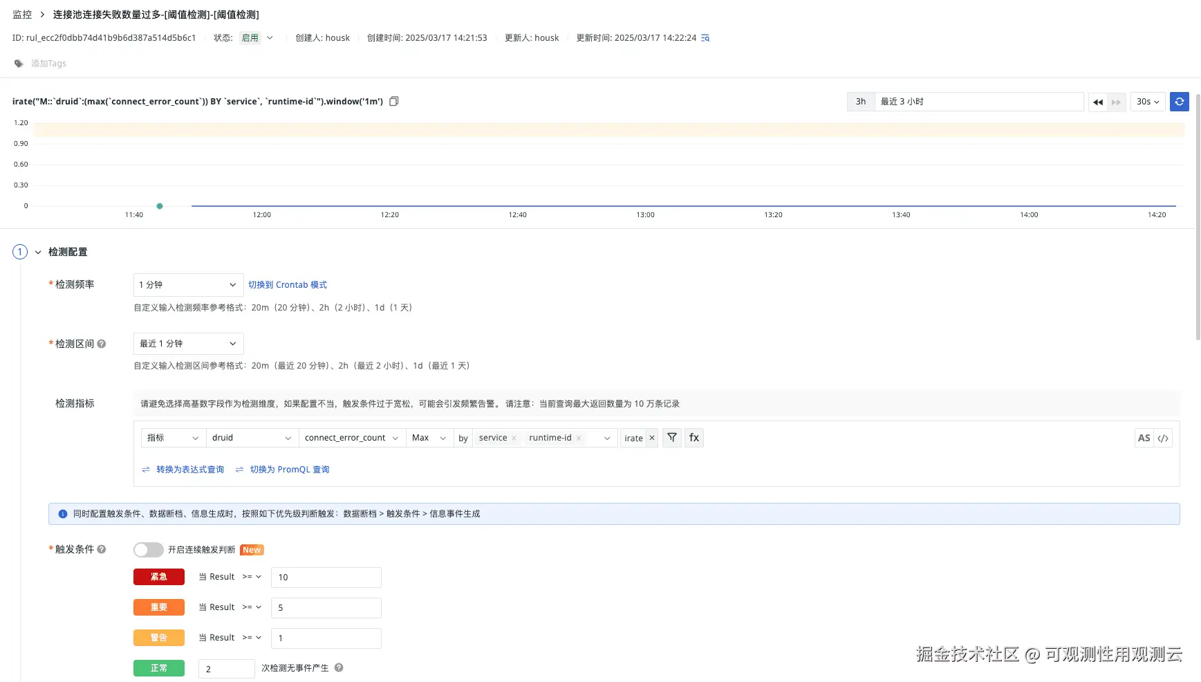简要描述:检测指标 connect_error_count , 出现错误的次数大于1个/秒,则触发告警,如下图: