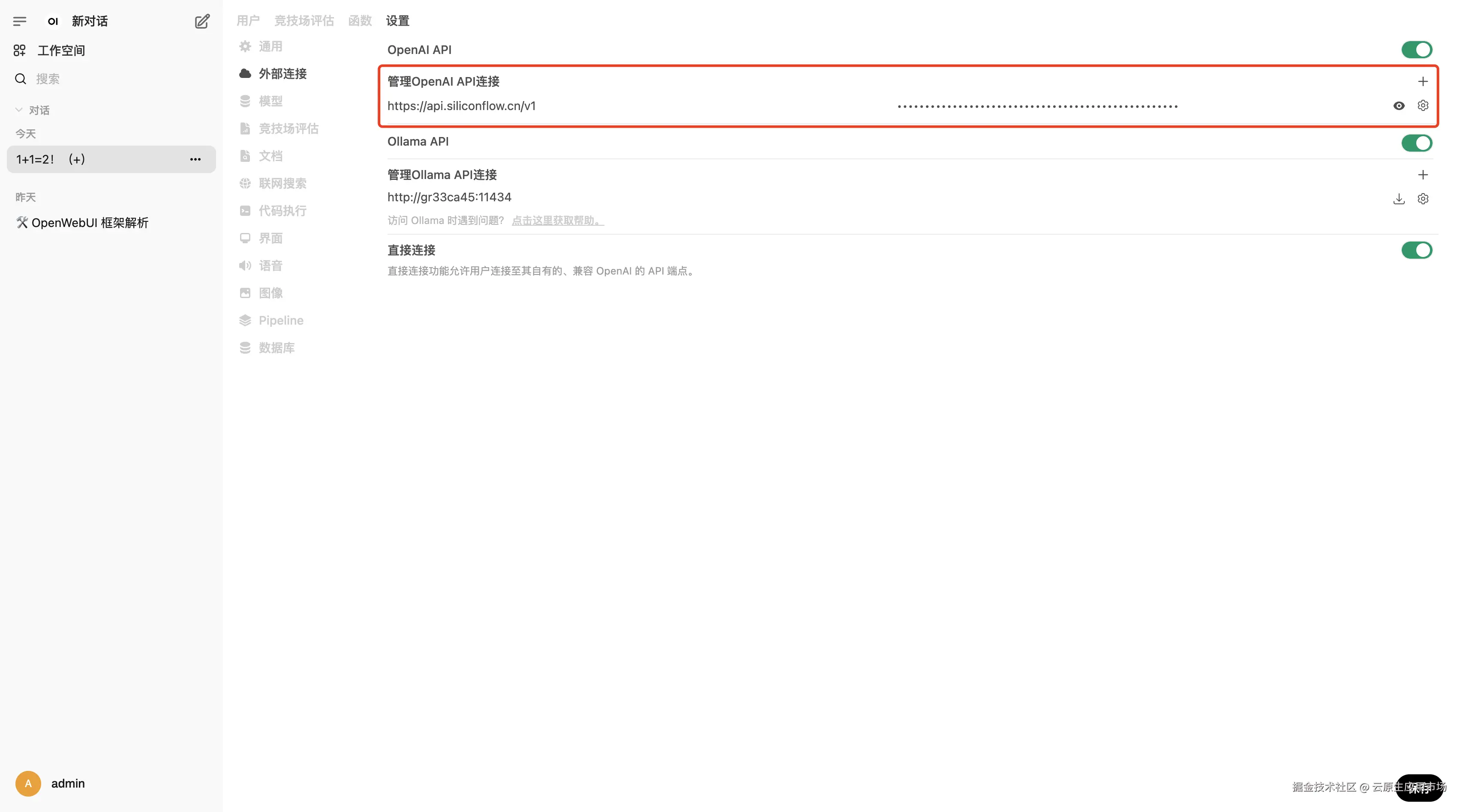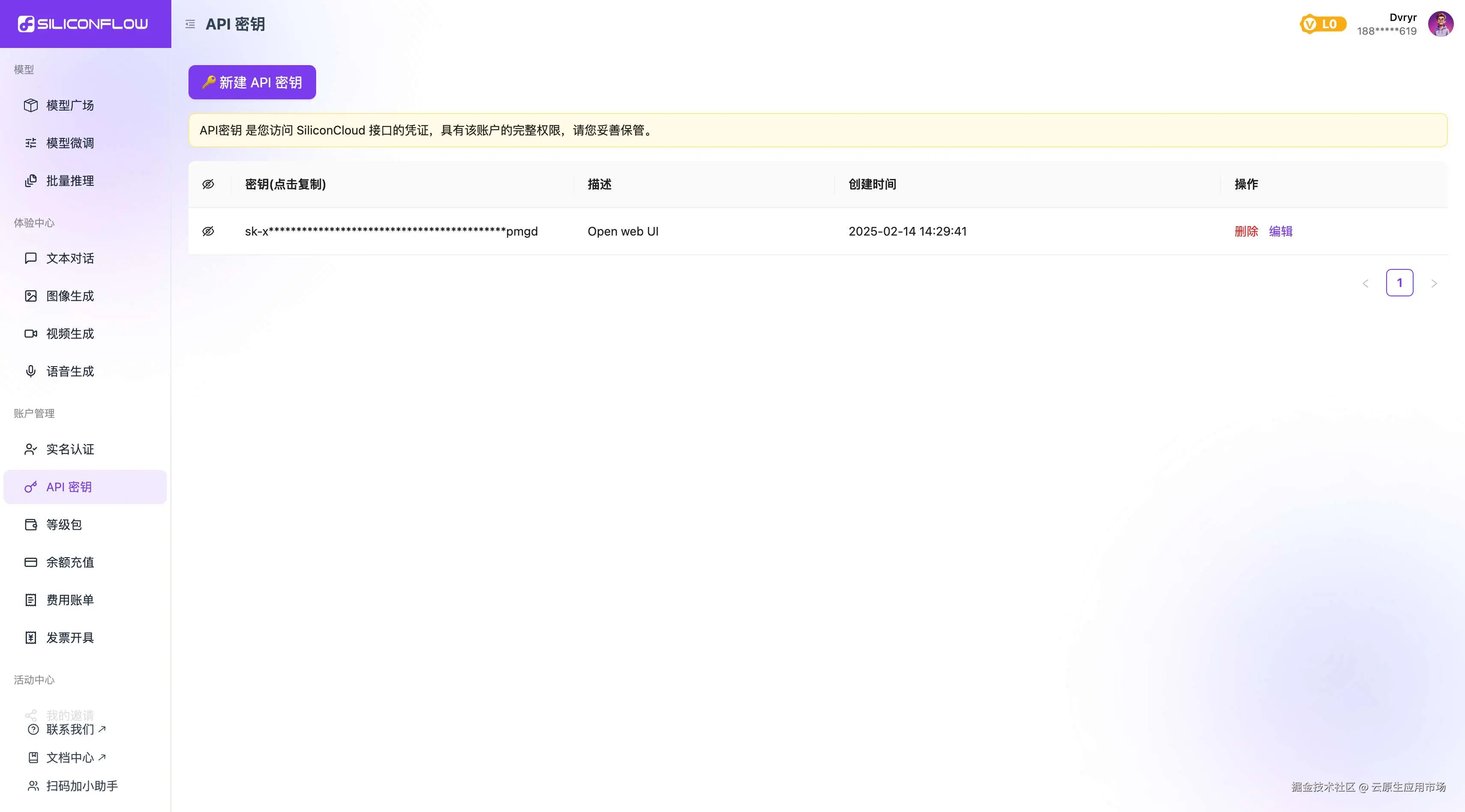 如果你不知道密钥怎么弄可以访问硅基流动:cloud.siliconflow.cn,硅基流动里面提供多种模型,邀请用户还能领取免费额度是一个不错的薅羊毛方式,直接新建密钥复制到 OpenWebUI 就可以正常使用。