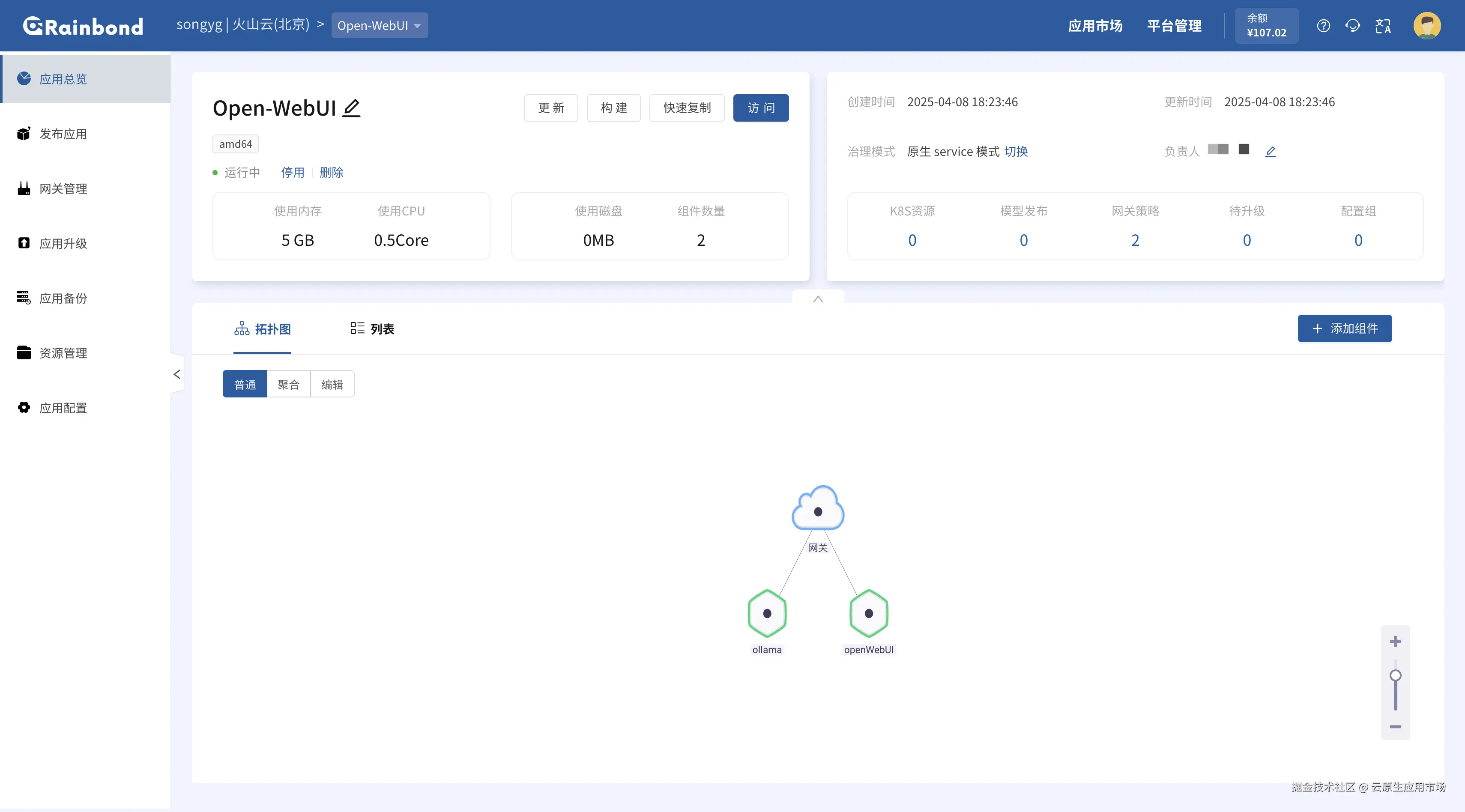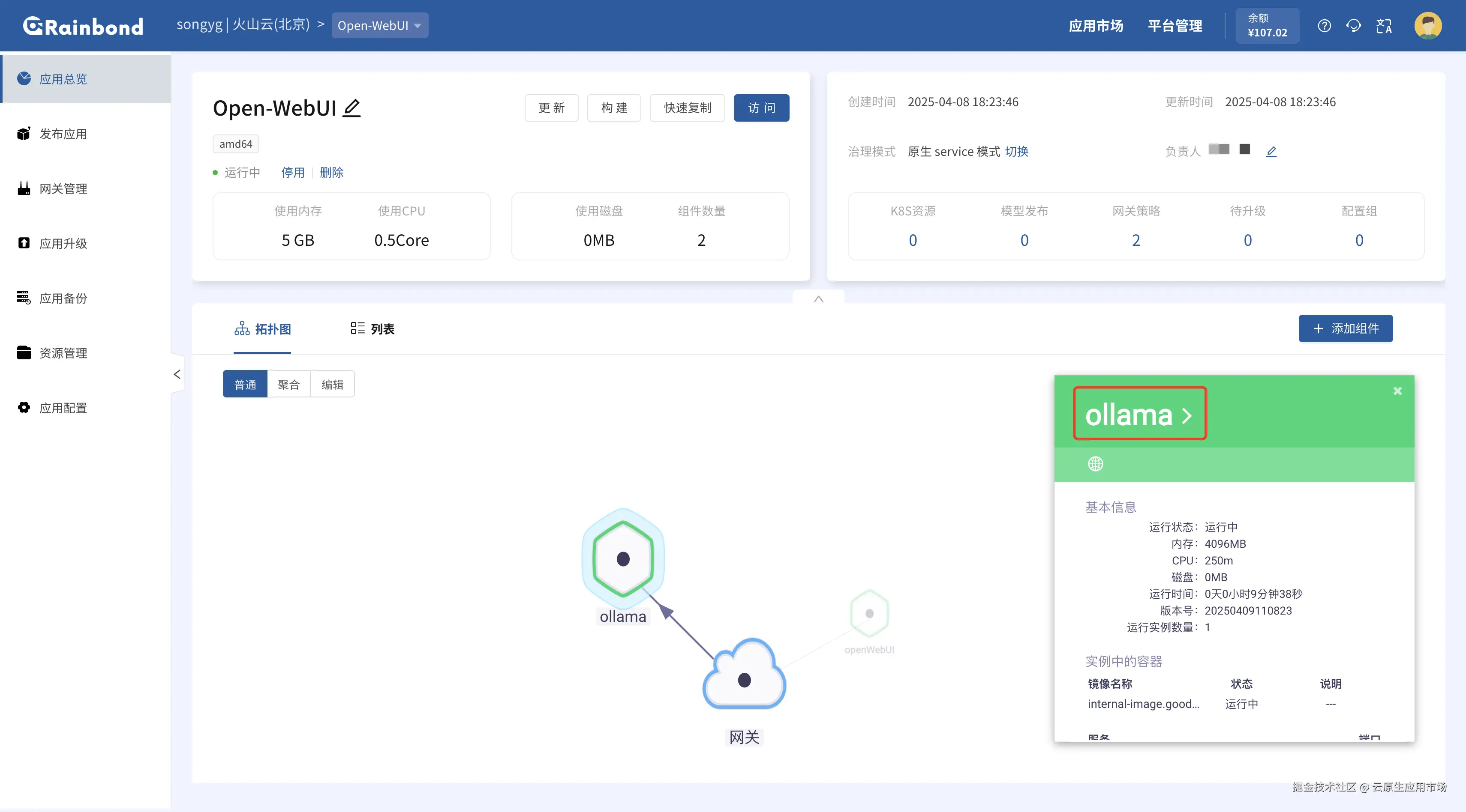 安装完成之后在拓扑图中会多出来一个 Ollama 的组件,绿色是运行中状态代表已经部署完成可以正常使用,这也是这个平台的特点之处,可以在平台上实现应用的开发,模块化拼装实现一个从前端、后端、中间件的一个完整应用。