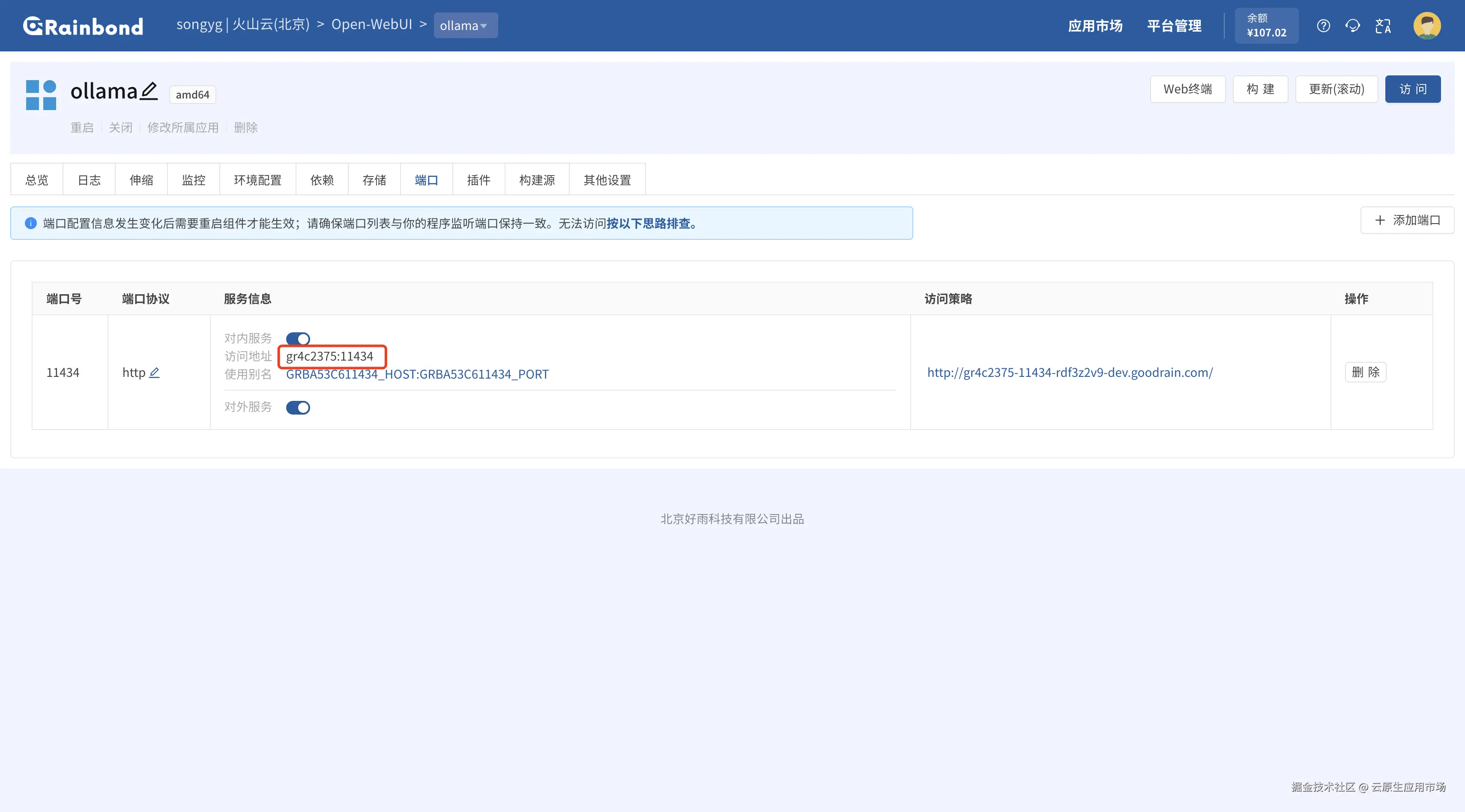 在 Open-WebUI 配置 Ollama 需要两个参数模型名称和地址,模型名称是上一步在 web 终端执行的模型 deepseek-r1:1.5b ,地址在组件视图选择端口,把访问地址添加到 Open-WebUI 的配置中。