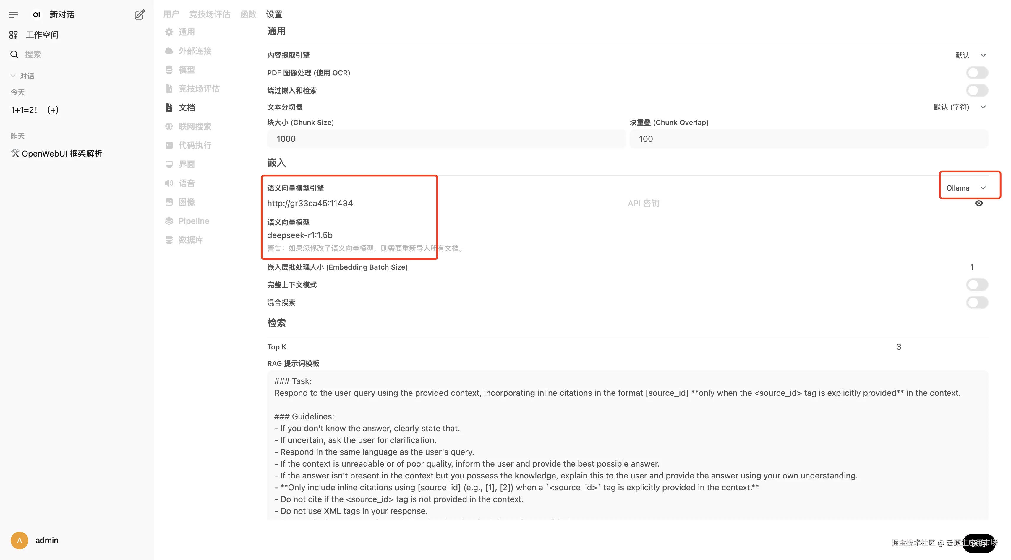 点击右上角头像->管理员面板->设置->文档,需要在右侧下拉框先选择 Ollama,然后把两个参数填上保存。